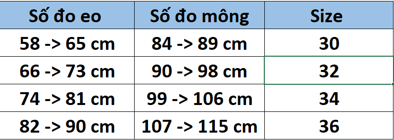 Bảng size: