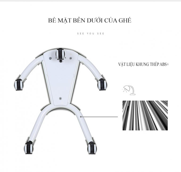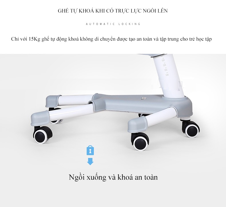 Chân bánh xe có hệ thống phanh trọng lực, ghế sẽ tự cố định vị trí khi có người ngồi, giúp trẻ ngồi vững chắc, êm ái, không rung lắc giúp bé tập trung vào trong việc học hơn.