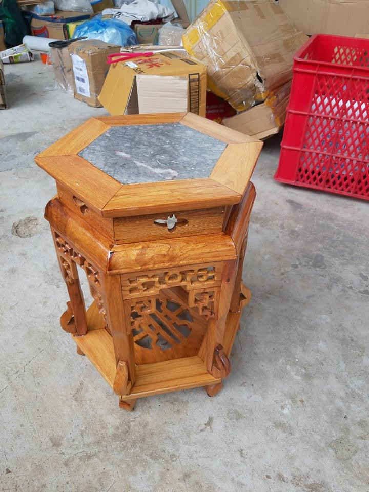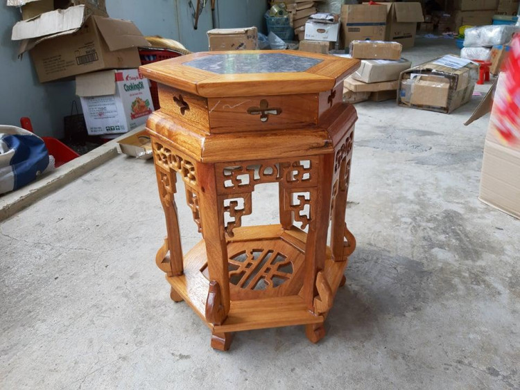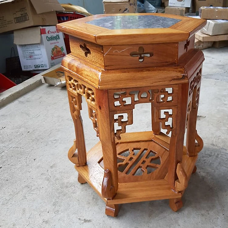 Ghế đôn lục giác cao 50cm, mặt ghế 32cm, kết hợp giữa gỗ và đá.