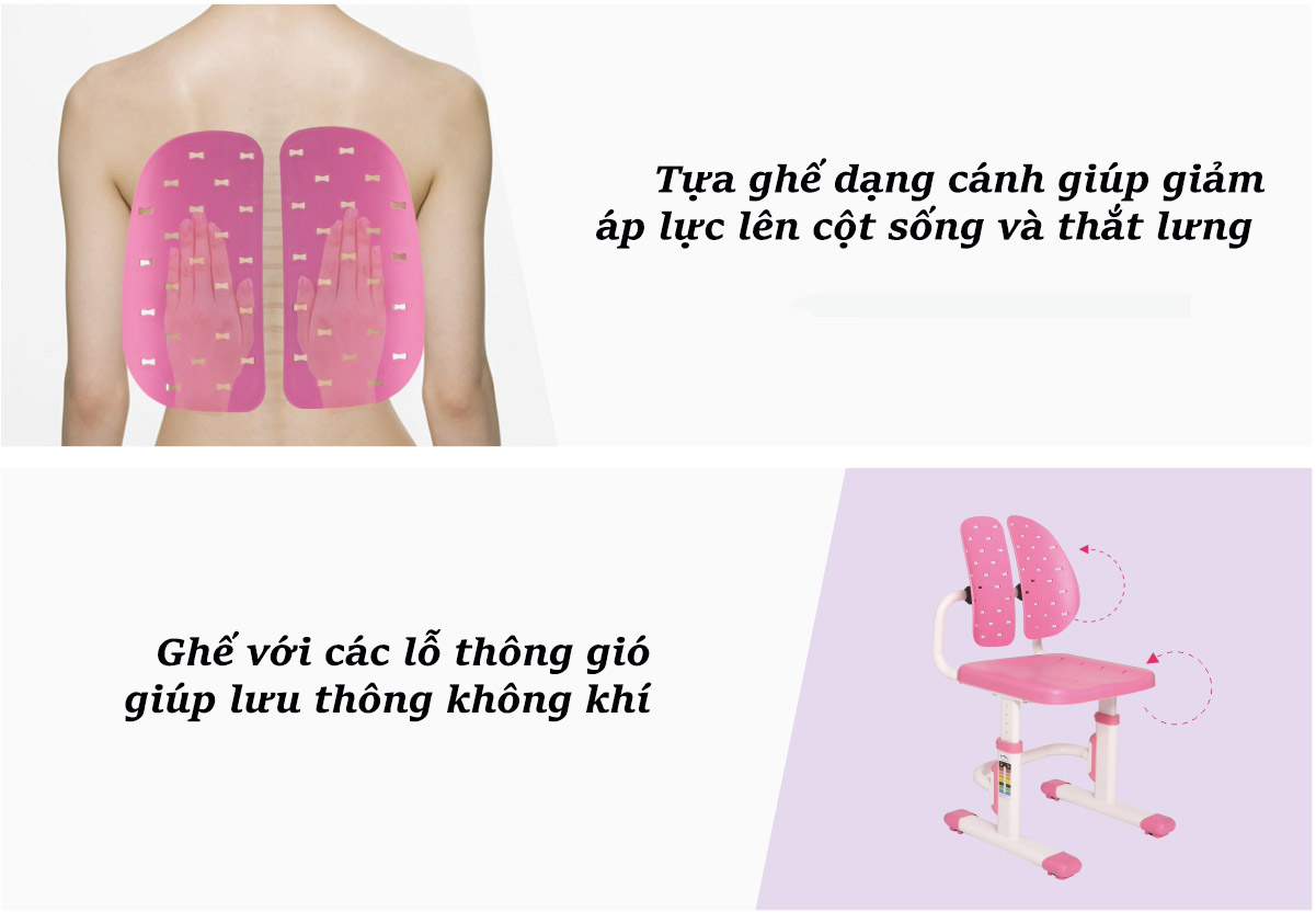 Mẫu ghế có tựa lưng 2 cánh dạng cong linh hoạt được thiết kế theo cấu trúc cột sống. Có tác dụng giảm tới 65% áp lực lên cột sống và vùng thắt lưng. Tăng lưu thông máu, thúc đẩy liên kết giữa các khối cơ khiến chúng không bị đau mỏi. Giúp trẻ cảm thấy thoải mái hơn khi ngồi.