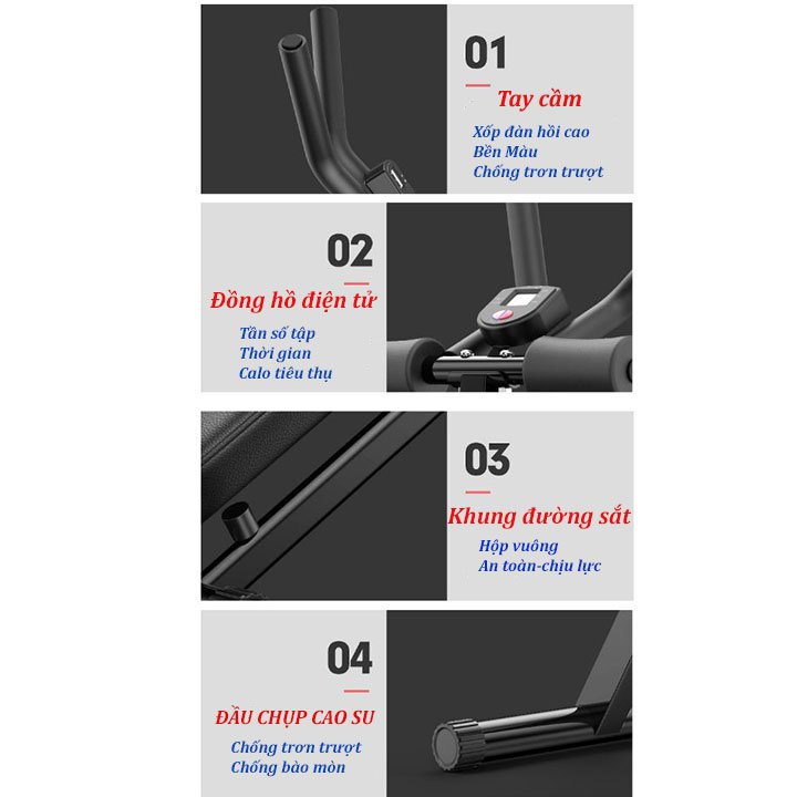 - Trang bị Đồng hồ điện tử đo nhịp tim, tần số dao động, tần số vận động, hiệu nặng, mức tiêu thụ calo, số lần tập, thời gian tập