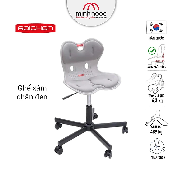[Ghế Roichen WOW Minh Ngọc] Ghế chỉnh dáng ngồi đúng có chân xoay Roichen - WOW Hàn Quốc. Ghế xám chân đen