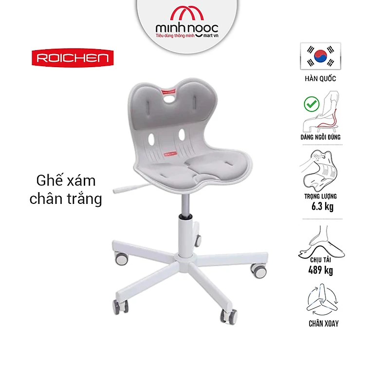 [Ghế Roichen WOW Minh Ngọc] Ghế chỉnh dáng ngồi đúng có chân xoay Roichen - WOW Hàn Quốc. Ghế xám chân trắng