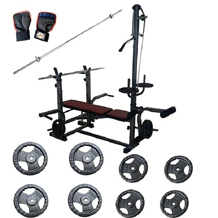 Ghế tập tạ đa năng kèm đòn tạ 1,5m, găng tập tạ và 60kg tạ gang