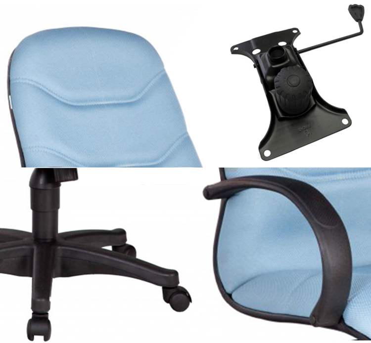 Toàn bộ lưng ghế được làm từ vải nỉ cao cấp, thoáng mát, sử dụng lâu bền không sợ rách và bong tróc. Phần nệm mút dầy tới 10 ly vô cùng êm ái, góp phần làm giảm áp lực cho người sử dụng trong môi trường làm việc căng thẳng. Hai tay vịn bằng nhựa PP đúc sang trọng, chắc chắn. Chân thép mạ crom chống rỉ sét. Bộ bánh xe PU đúc giúp bạn dễ dàng xoay tròn và di chuyển. Cần nâng hạ độ cao rất nhẹ nhàng, dễ điều chỉnh cho người sử dụng nhờ bộ ly hợp hiện đại và bộ piston khí nén cao cấp nhập khẩu.