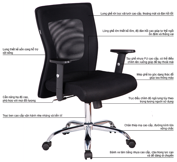 - Chân thép mạ sang trọng, đường kính lớn vững chãi. Bánh xe nhựa PP đúc chịu lực tốt, có thể xoay tròn đủ hướng, giúp người ngồi dễ dàng di chuyển.