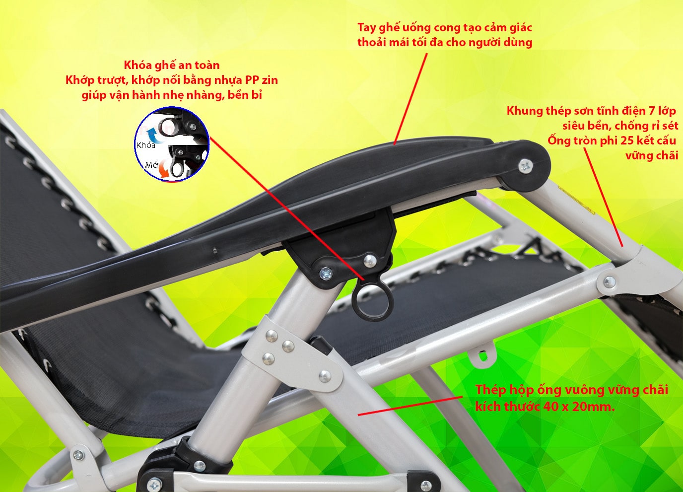 - Dễ dàng điều chỉnh góc nghiên của ghế và khóa lại bằng khóa tiện dụng được tích hợp ngay phía bên dưới tay ghế, có thể chiều chỉnh trực tiếp khi đang sử dụng mà không cần ngồi dậy. Khóa này có thể khóa ở góc nghiêng bất kỳ của ghế, tùy theo nhu cầu sử dụng