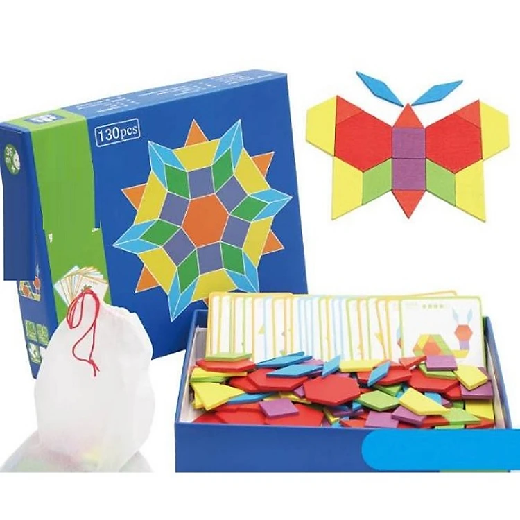 - 130 chiếc khối hoa văn, 24 thẻ thiết kế và 1 túi lưu trữ bao gồm các mảnh là hình tam giác màu đỏ, hình thang màu vàng, kim cương lớn màu xanh, kim cương nhỏ màu xanh lá cây, hình lục giác màu đỏ và hình vuông màu tím. Bộ khối và bảng mẫu được thiết kế để làm cho việc học trở nên thú vị và đẹp mắt!