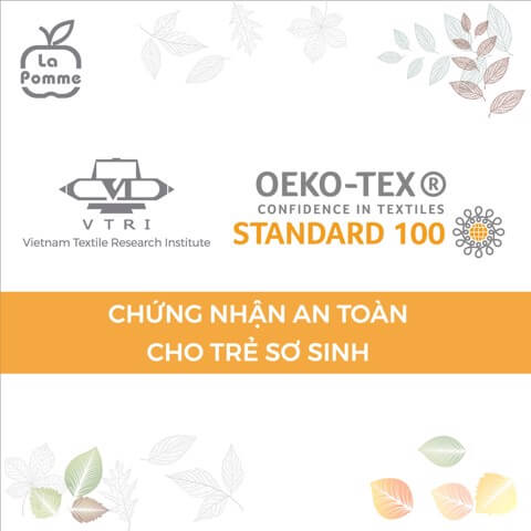 Mọi phụ liệu vải, cúc, khuy bấm, chỉ may…đều đạt chứng nhận OEKO-TEX 100, chứng nhận do 18 viện nghiên cứu và kiểm định hàng dệt may của Châu u và Nhật Bản cấp; và được Viện Dệt May Việt Nam (VTRI) chứng nhận đạt tiêu chuẩn QCVN 01217/BCT – Sản phẩm an toàn với trẻ sơ sinh.