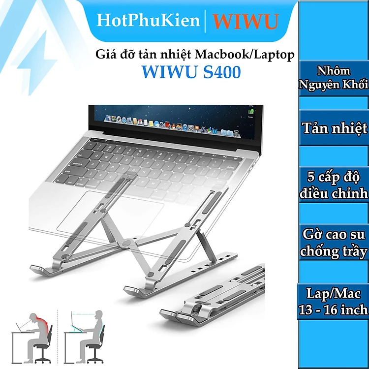 Giá đỡ Aluminum Wiwu S400 cho Macbook laptop 13 inch đên 15.5 inch giúp tản nhiệt thiết kế nhôm nguyên khối - Hàng nhập khẩu
