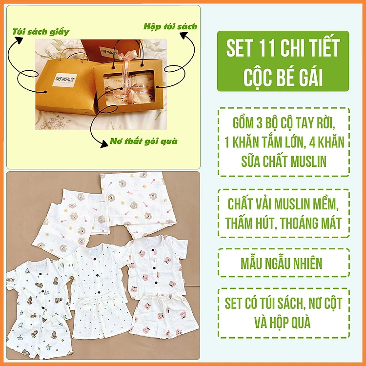 [GIÁ HỦY DIỆT] Set Quà Tặng Sơ Sinh 11 Chi Tiết Chất Vải Muslin Cho Bé Trai Và Bé Gái
