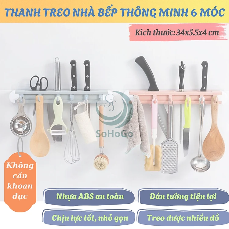 Giá treo dụng cụ nhà bếp đa năng -Kệ treo tường có móc và khe cắm dao kéo -Thanh treo nhà bếp thông minh 6 móc