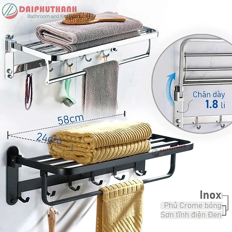 Giá Treo Khăn Kết Hợp Móc Quần Áo Nhà Tắm Inox SUS304 Đa Năng Gấp Gọn - Có loại sơn tĩnh điện đen, chiều ngang 58cm