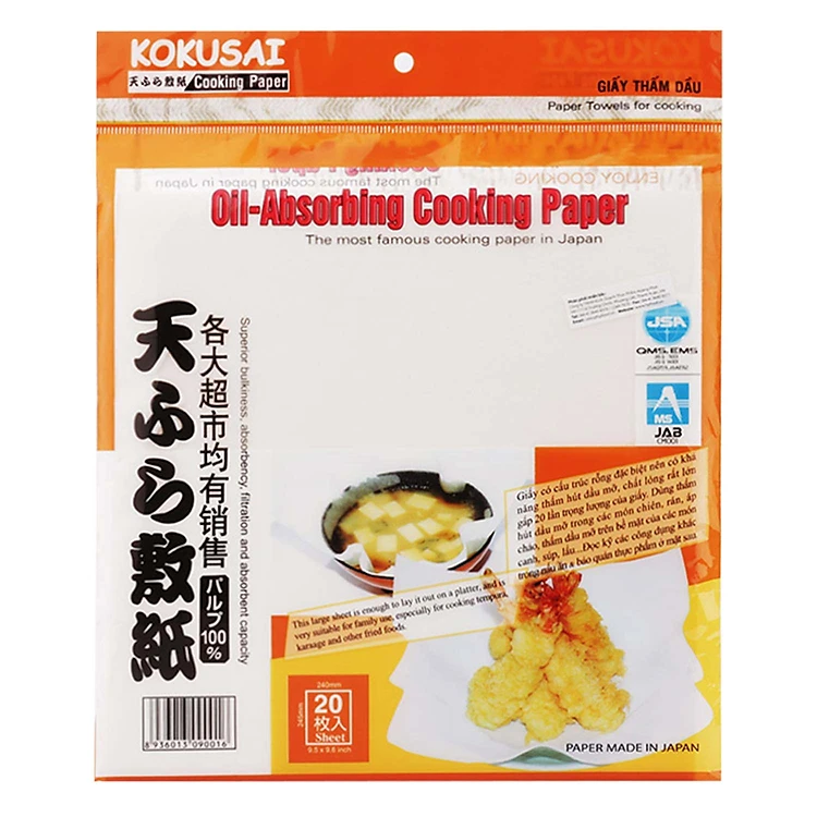 Giấy Thấm Dầu Thực Phẩm Kokusai GTDD00090016 - 24x24.5cm - 20 Tờ có cấu trúc rỗng đặc biệt nên có khả năng thấm hút dầu mỡ gấp 20 lần trọng lượng của giấy. Dùng thấm hút dầu mỡ trong các món chiên, rán, áp chảo, thấm dầu mỡ trên bề mặt của các món canh, súp, lẩu...