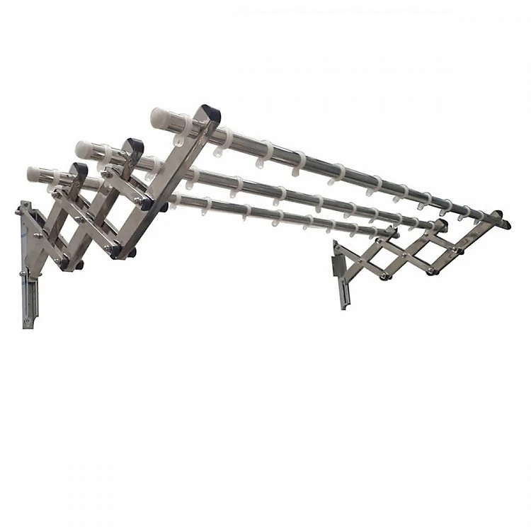 Giàn phơi gắn ( xếp ) tường gồm có 3 thanh Inox luôn sáng đẹp với các kích thước 1.5m, Hệ càng nâng:Thiết kế đẹp mắt và được chế tạo bằng các thanh inox hộp, liên kết bằng hệ vít keo linh hoạt, có sức nâng lớn (45kg), siêu bền. Năm sản xuất: Năm 2018. Cơ chế làm việc: giàn phơi 3 thanh inox D32mm dài 1,5m/thanh, kéo ra - xếp vào nhẹ nhàng, dễ sử dụng. Tải trọng thiết kế: 45 kg. Kèm theo 15 khoen định vị chống xô bay đồ phơi