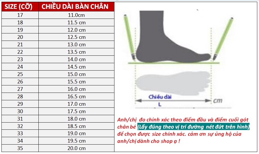 Bảng đo size giày của bé Quý khách vui lòng xem size giày bé thực tế đang đi hoặc tham khảo dưới đây: