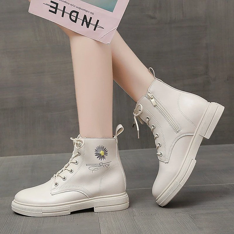 Giầy Boots nữ chất da cao cổ buộc dây thêu họa tiết