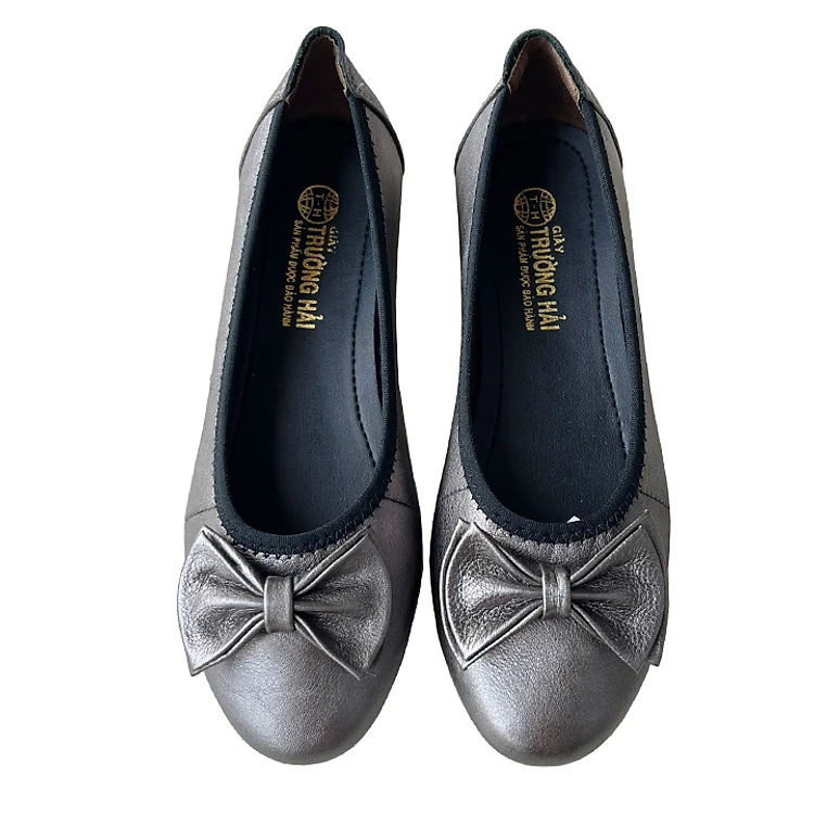Giày búp bê da bò mũi tròn màu xám đính nơ Trường Hải da mềm mại BB130