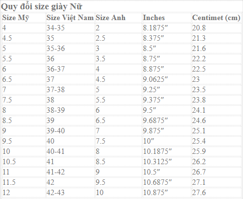 Bảng chọn size chân :