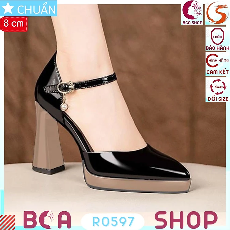 Giày cao gót nữ phối màu đế 8p RO597 ROSATA tại BCASHOP bề mặt đen bóng phối đế và gót nâu nhìn độc đáo và sang trọng