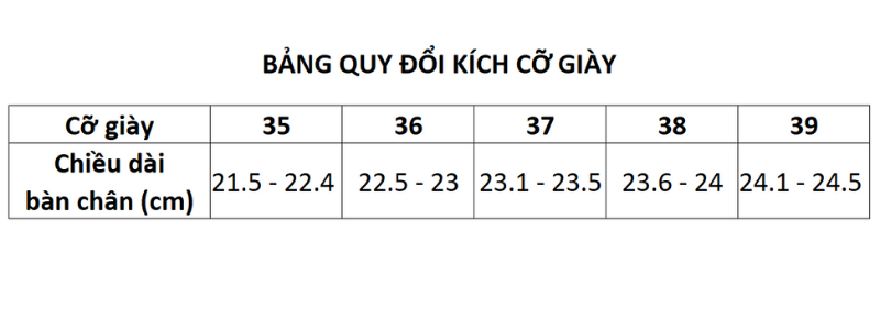 Có đủ cỡ giày: 35, 36, 37, 38, 39