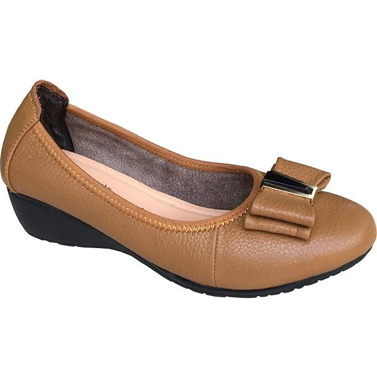 Giày đế xuồng nữ 3cm Trường Hải đính nơ xinh da bò mềm mại màu vàng thời trang , đế xuống cao su DX0132