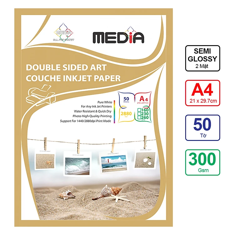 - Giấy In Màu Media 2 Mặt Lụa A4 300gms 50 Tờ sở hữu chất lượng cao với một mặt phủ bóng, cho khả năng chống thấm nước, lem màu hiệu quả hơn.