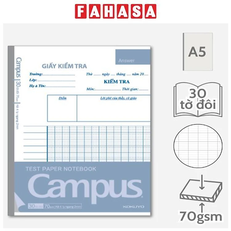 Giấy Kiểm Tra Kẻ 4 Ly Ngang Dạng Vở A5 - Campus TPN-A5LY30 (30 Tờ Đôi)