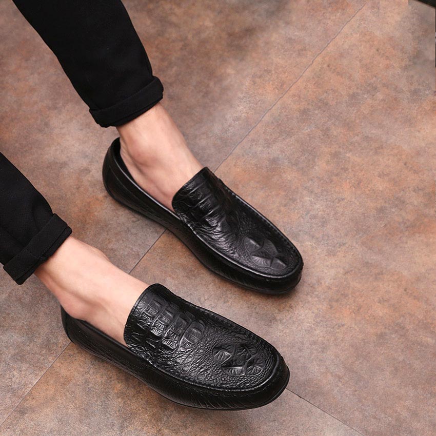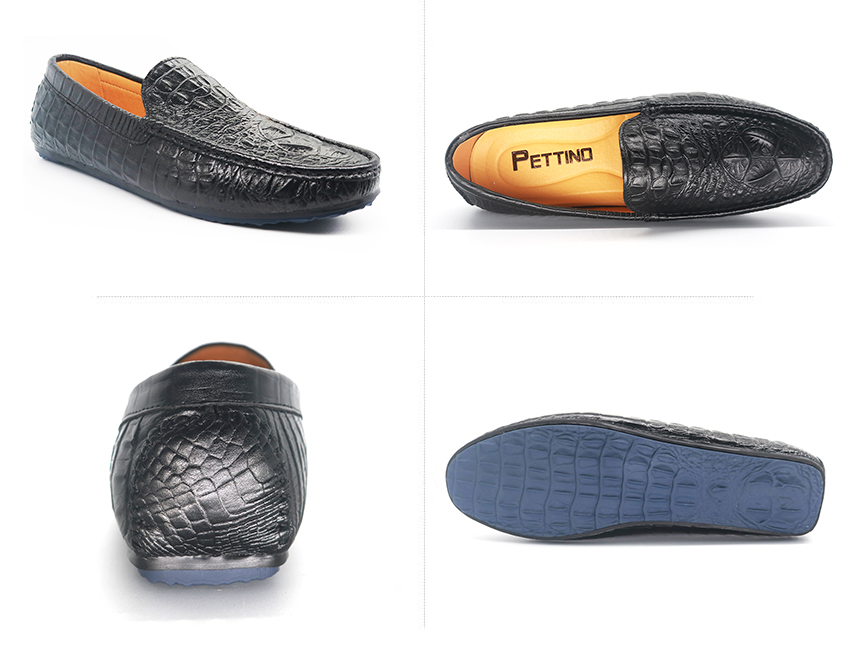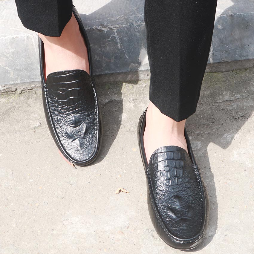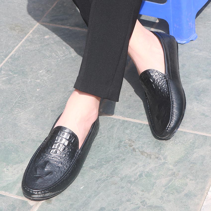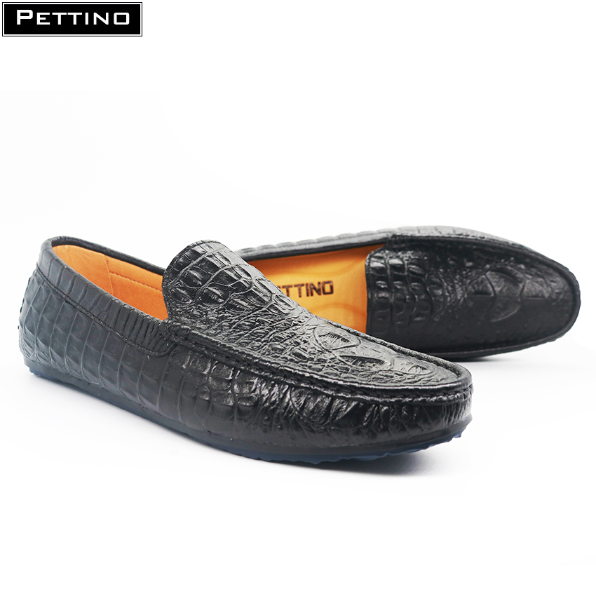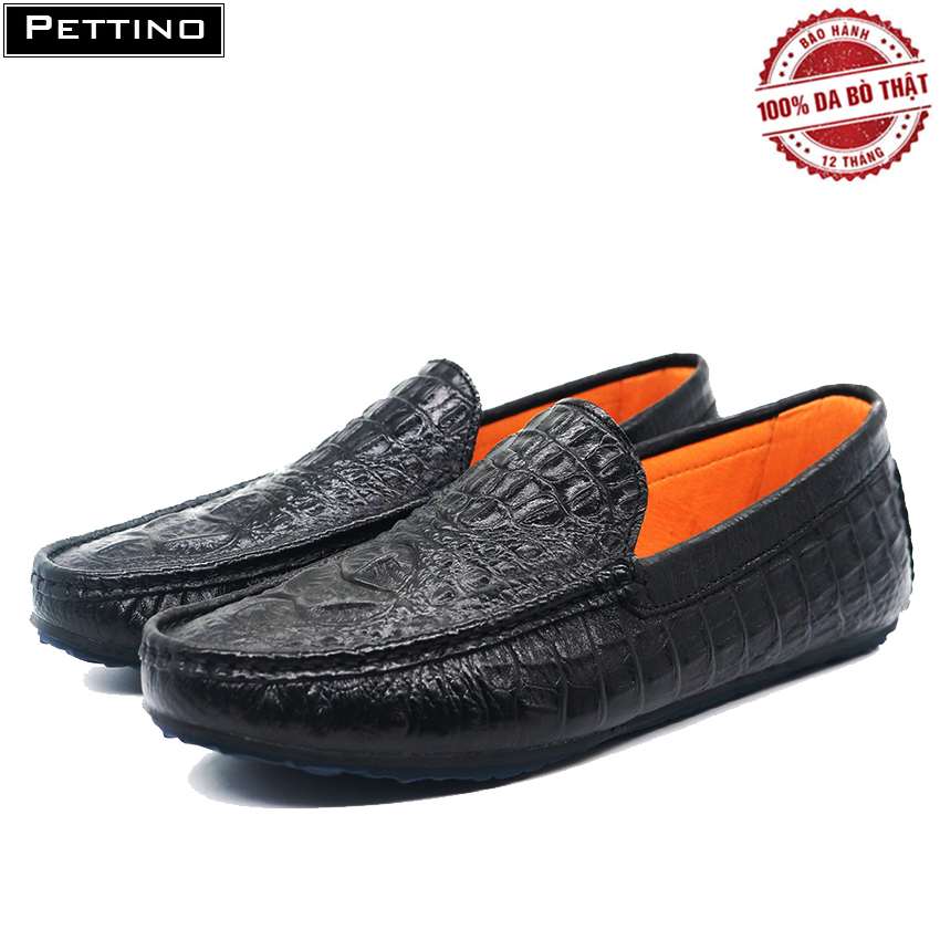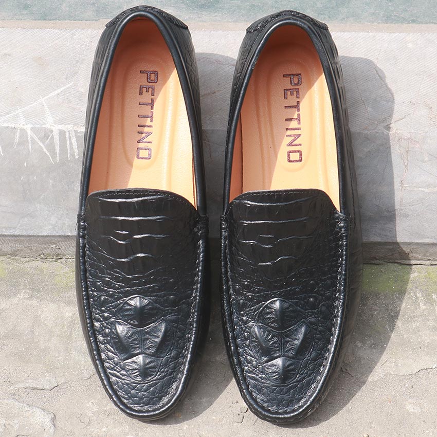 Giày Lười Nam Da Bò Thật Nguyên Tấm Dập Vân Cá Sấu Sang Trọng Pettino PL09 Màu Đen