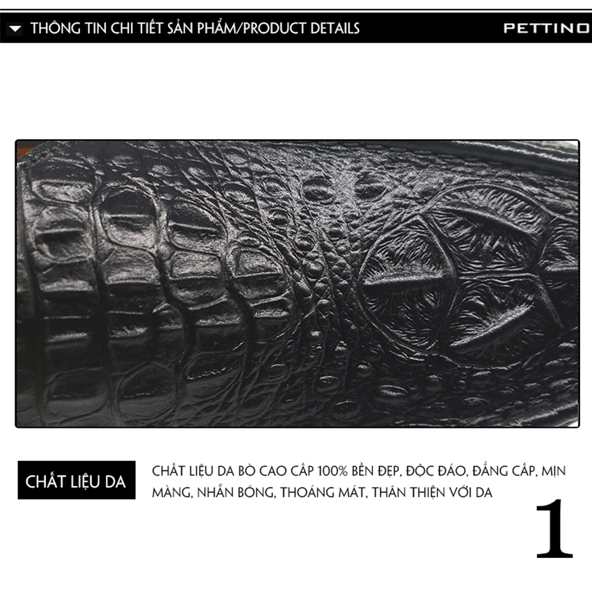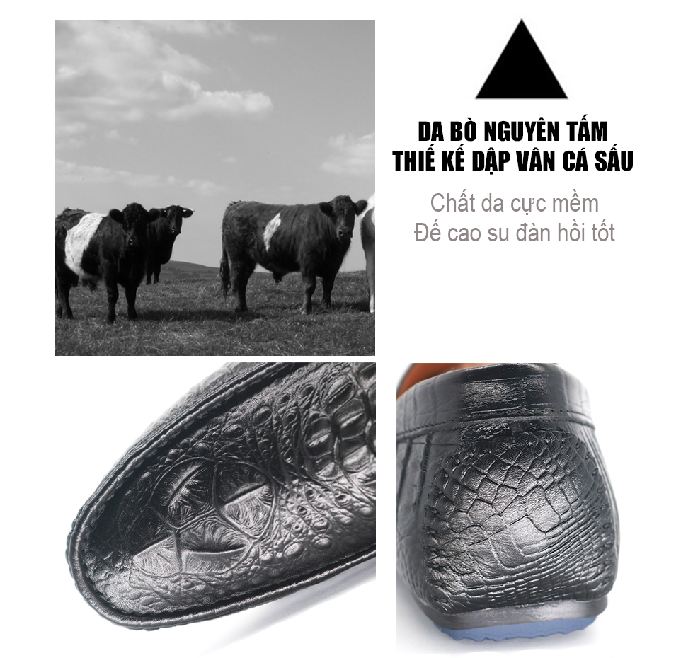 • Chất liệu: Da bò (100%) nguyên tấm, dập vân cá sấu, đế cao su vừa dán keo vừa khâu rất chắc chắn