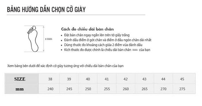 Để chọn được đôi giày ưng ý và vừa vặn nhất với đôi chân của mình, quý khách vui lòng dùng thước đo chiều dài bàn chân của quý khách theo mẫu trên và ghi vào phần ghi chú để nhân viên chăm sóc khách hàng gọi xác nhận và tư vấn cho quý khách!