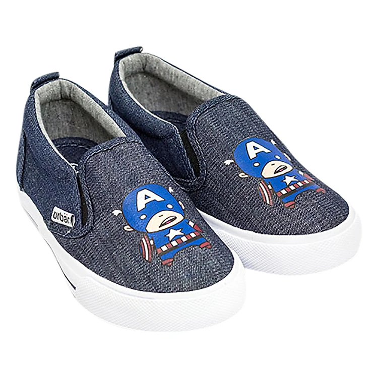 • Giày Slip On Bé Trai Urban UB1702 – Xanh Bò được thiết kế với kiểu dáng năng động, bề mặt màu xanh trơn đơn giản, có trang trí họa tiết nhân vật Caption America đáng yêu, mang đến sự năng động cho bé trai.