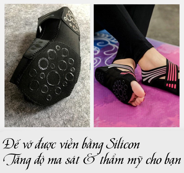 - Đặc biệt, hơn cả một đôi giày Yoga thông thường, phần đế mềm lót chân bảo vệ lòng bàn chân và gót chân, giúp bạn tập luyện thoải mái. Mặt ngoài được đính những đường vân Silicon tăng độ bám, giảm ma sát khi tập. Đường viền thiết kế độc đáo và nổi bật tạo nên nét đặc biệt riêng cho người sử dụng.