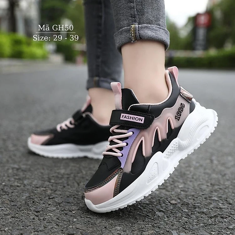 Giày thể thao bé gái học sinh tiểu trung học nhẹ êm chân màu đen hồng kiểu dáng thời trang quai dán phù hợp cho trẻ em nữ 5 đến 12 tuổi đi học đi chơi khỏe khoắn và năng động Nhím Shop GH50
