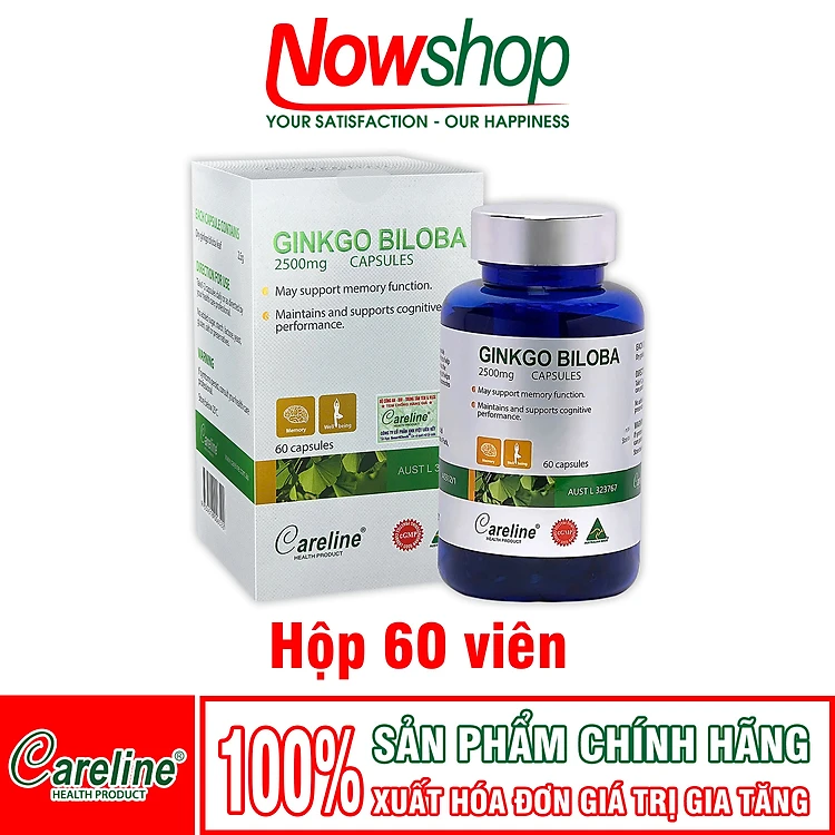 Ginkgo Biloba 2500mg Careline hộp 60 viên tăng tuần hoàn não giảm đau đầu chóng mặt tiền đình