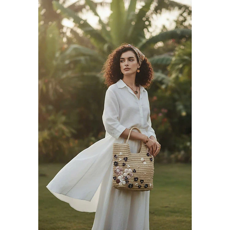 Giỏ Cói Giấy Mềm Dáng Tote Gắn Vỏ Sò, Giỏ Cói Tote Hải Đường ACC142