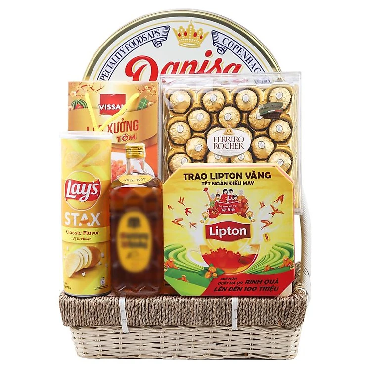 _ Giỏ Quà Tết - Phúc Thọ Vô Biên gồm 8 món: Rượu Whisky Suntory 700ml, Bánh Danisa Gold Edition 792g, Lạp xưởng tôm Vissan hộp 500g, Socola Ferrero Rocher 300G (Hộp 24 Viên), Bánh Xốp Kem Hương Dâu Choice L Hộp 156g, Snack Khoai tây Lay's vị tự nhiên 160g, Bánh Quy AFC Vị Lúa Mì Hộp 200g (25G x 8 Gói), Trà Đen Túi Lọc Lipton Nhãn Vàng Hộp 50g._ Giỏ Quà Phúc Thọ Vô Biên mang thông điệp mong một mùa xuân an khang, thịnh vượng cho người nhận, thích hợp tặng người thân, bạn bè hay đối tác.