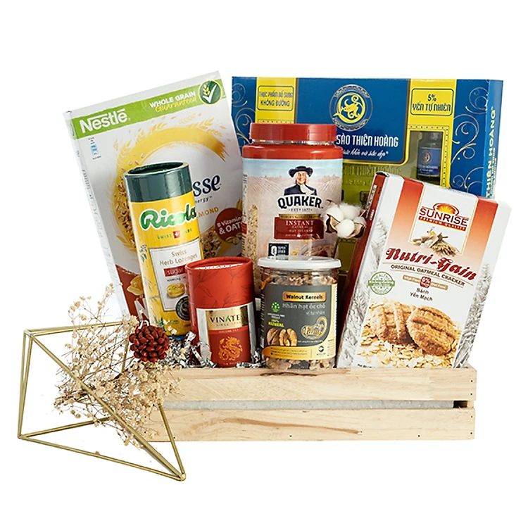 Giỏ Quà Big C Xuân An Khang MS 700 gồm các sản phẩm Lô 6 Nước Yến Sào Thiên Hoàng Không Đường 70ml, Kẹo Ricola Thảo Mộc Hộp Giấy 100g, Bánh Ăn Sáng Fitnesse Trái Cây 450g, Hạt Óc Chó Tách Vỏ Nam Du 200g, Yến Mạch Quaker 600g, Bánh Yến Mạch Sunrise Các Loại 178g, Trà Vinatea Hương Việt Sen/ Nhài/ Olong 10x8g (giao ngẫu nhiên) có kiểu dáng đẹp mắt; phù hợp để chọn lựa làm quà biếu tặng đến người thân, bạn bè,