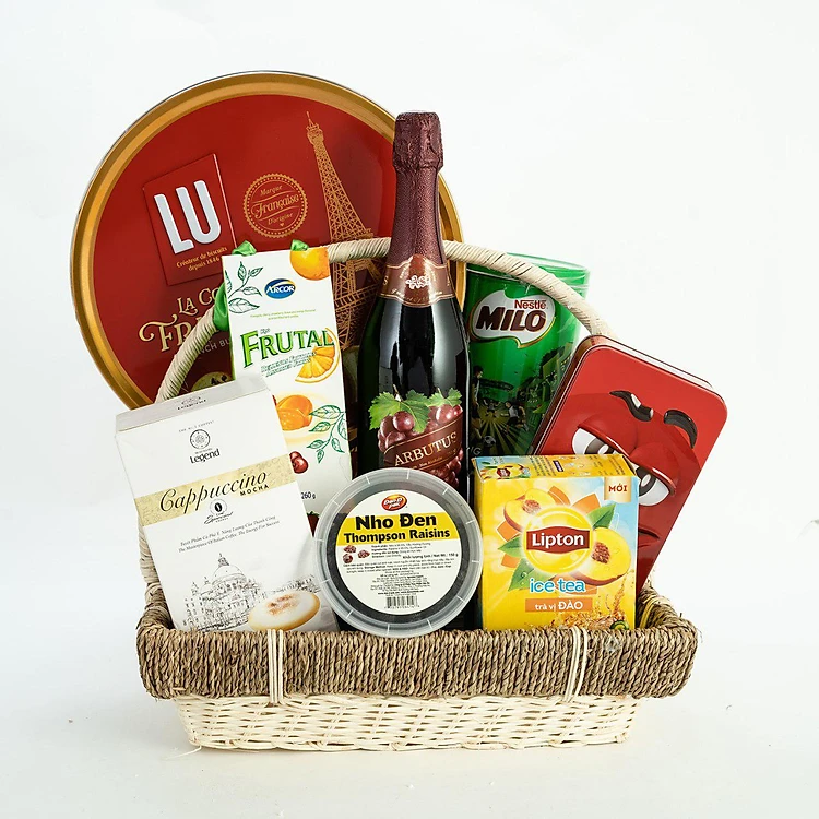 Giỏ Quà Xuân Cẩm Tú Big C MS 650B gồm các sản phẩm Nước Ép Có Ga Arbutus Táo/ Nho Xanh 750ml (giao ngẫu nhiên), Bánh Lu Assorted Cookies Hộp Thiếc 894g, Chocolate M&M Hộp Tết Đỏ/ Vàng 145g, Cafe G7 Capuchino Hazenut/ Mocha 12x18g (giao ngẫu nhiên), Nho Khô Đen 150g, Trà Icetea Lipton Chanh/ Đào/ Xoài 16x14g (giao ngẫu nhiên), Bột Milo Lúa Mạch 285g, Kẹo Frutal Quai Túi 260g có kiểu dáng đẹp mắt; phù hợp để chọn lựa làm quà biếu tặng đến người thân, bạn bè,