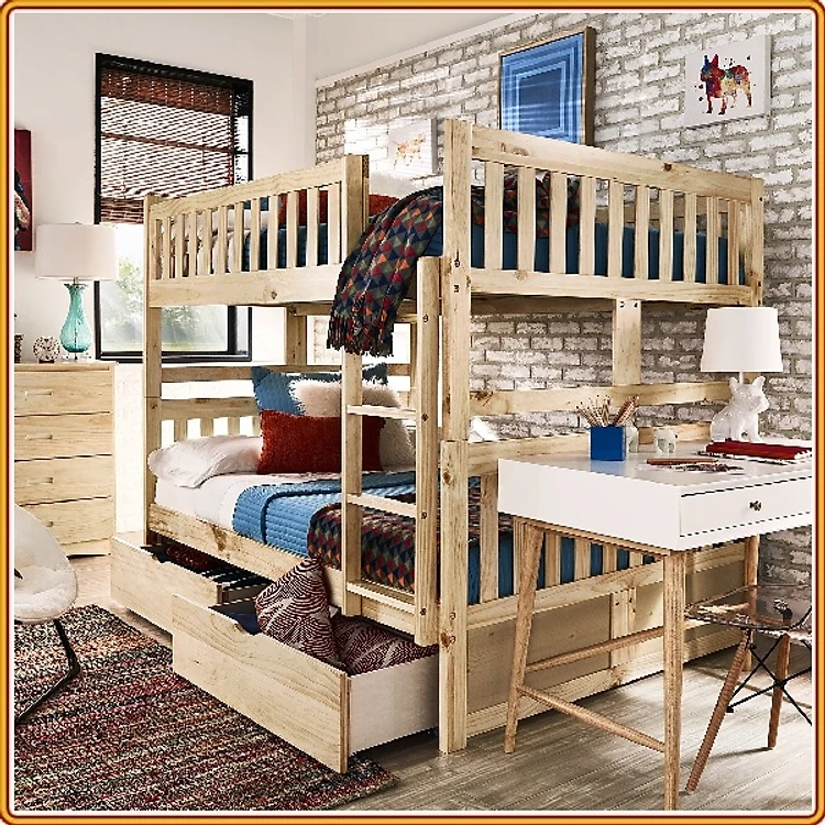 Giường 2 tầng Tundo màu tự nhiên cầu thang treo kèm 2 hộc kéo 1m