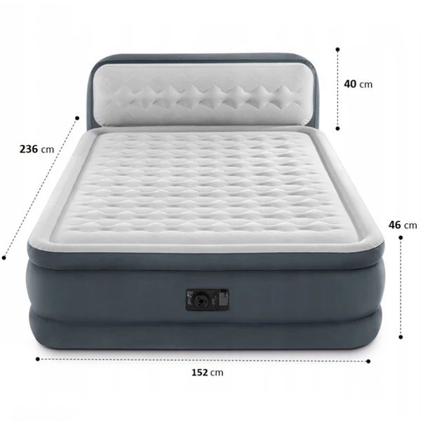 - Giường hơi tự phồng cao cấp Intex 64448 sử dụng công nghệ mới Fiber tech siêu bền, sau khi bơm có kích thước: dài 236cm, rộng 152cm, cao 46cm. Phần thành giường tựa đầu cao 86cm, sử dụng công nghệ Fiber-tech siêu bền, màu sắc trang nhã và không kém phần sang trọng