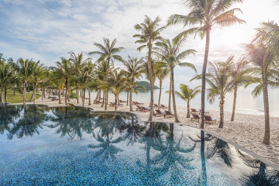 Sẽ là thiếu sót lớn nếu không nhắc đến các bể bơi vô cực nằm trong khuôn viên JW Marriott Phú Quốc Emerald Bay Resort 5*; nổi bật nhất có bể bơi hình vỏ sò “đẹp ảo diệu”, hướng tầm mắt du khách về bãi biển riêng lồng lộng gió. Còn gì tuyệt vời hơn là được ngâm mình trong làn nước mát, thưởng thức một ly mocktail hay đọc sách dưới ánh nắng ban mai ấm áp? Bãi biển riêng và các bể bơi cũng là những địa điểm chụp ảnh check-in được du khách nghỉ dưỡng tại đây yêu thích.