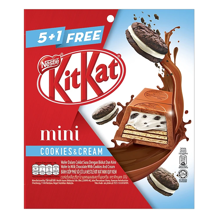 Gói 5 + 1 Thanh Kit Kat Mini Vị Bánh Quy Kem (15g / Thanh) giòn mềm, vỏ ngoài được bọc bởi lớp sô cô la mịn, phần nhân là lớp bánh xốp và kem với hương vị bánh qui kem thơm ngon, mang đến cho bạn sự lựa chọn tuyệt vời để thưởng thức cùng người thân, bạn bè. Bạn cũng có thể dùng bánh như bữa ăn phụ, giúp bạn bổ sung năng lượng và chất dinh dưỡng hợp lý.