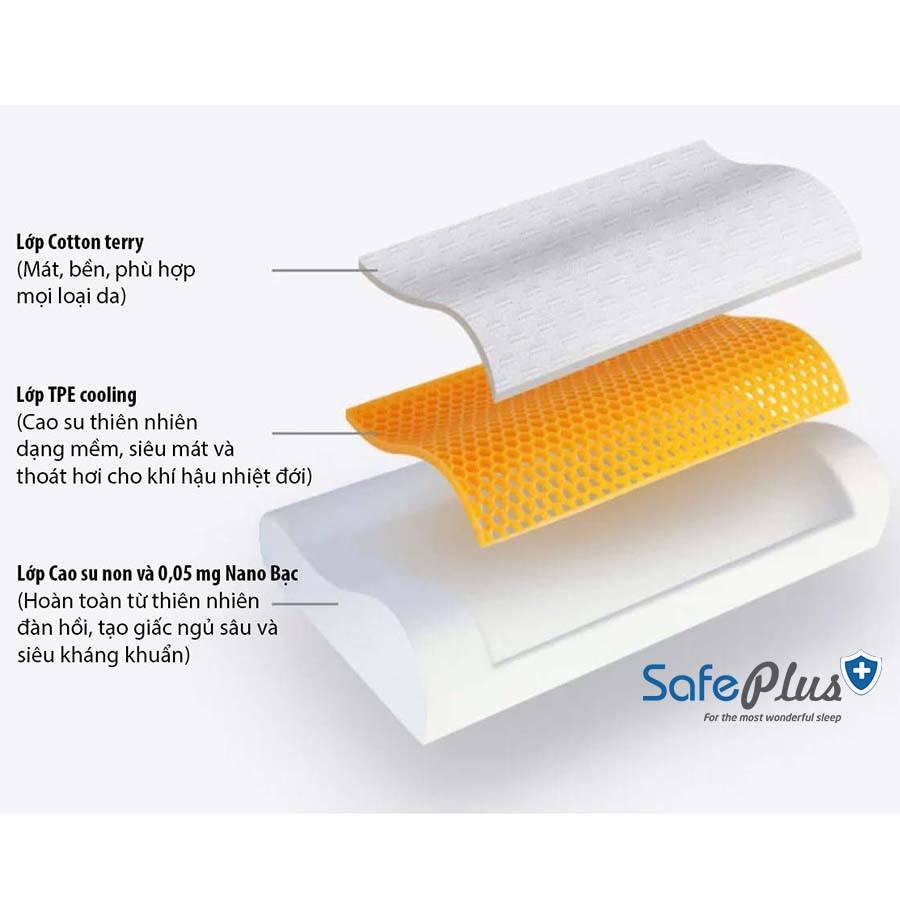Gối được sản xuất từ chất liệu cao su non được nghiên cứu bởi NASA Mỹ với độ đàn hồi cực tốt, độ bền cực cao từ 6-10 năm. Kết hợp với lớp Nano bạc diệt khuẩn giúp tránh lây vi khuẩn ngược từ gối lên vùng đầu và mặt. Tránh được nguy cơ nhiễm khuẩn đường hô hấp. Gối còn được trang bị thêm lớp TPE cooling siêu thoáng mát công nghệ Mỹ chỉ có trên gối Safeplus. Kết hợp vỏ gối terry cao cấp giúp khách hàng luôn tìm được cảm giác thoáng mát khi đặt mình lên gối. Không còn hiện tượng nóng gáy, đổ mồ hôi lưng gáy khi ngủ.
