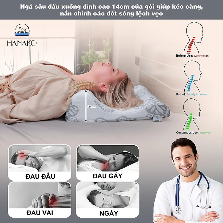 Gối chống thoái hóa đốt sống cổ chuyên dụng 2 đầu gối cao thấp HANAKO - hỗ trợ giảm thiểu đau mỏi vai gáy, cột sống