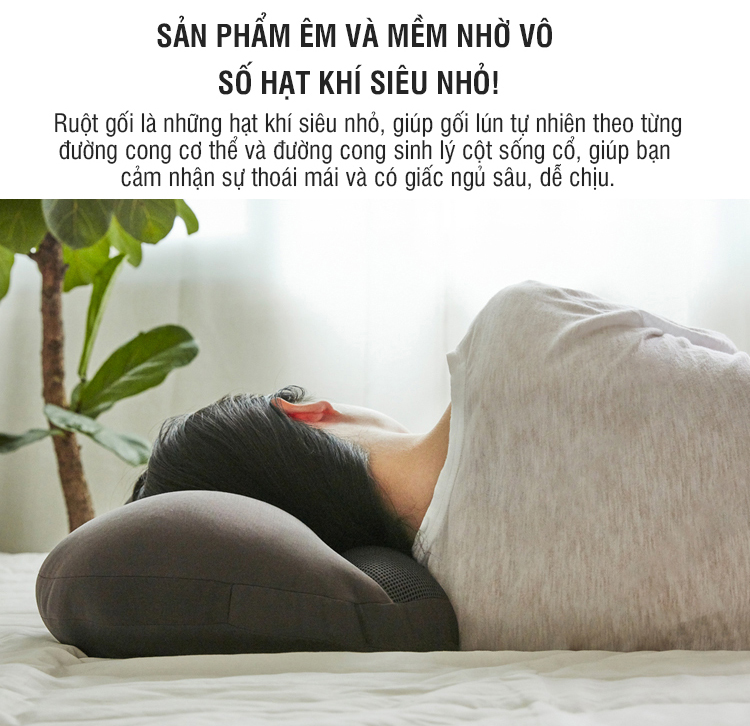 với ruột gối là những hạt khí siêu nhỏ, giúp gối lún tự nhiên theo từng đường cong cơ thể và đường cong sinh lý cột sống cổ, giúp bạn cảm nhận sự thoái mái và có giấc ngủ sâu, dễ chịu.