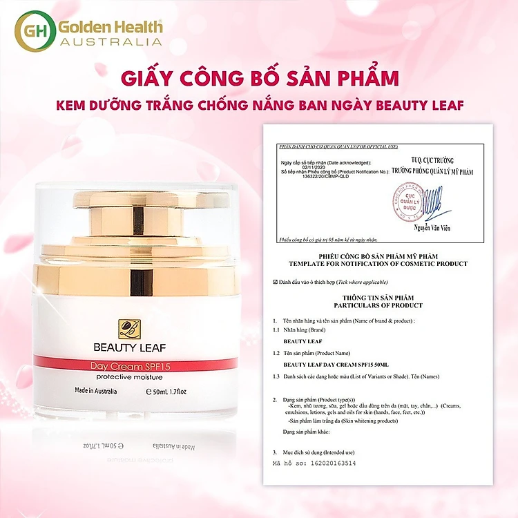 [GOLDEN HEALTH] Kem Dưỡng Trắng Da Ban Ngày, Chống Nắng, Mờ Thâm, Nám, Tàn Nhang Nuôi Dưỡng Làn Da Trắng Sáng Hồng Hào Từ Sâu Bên Trong Beauty Leaf SPF15 50ml