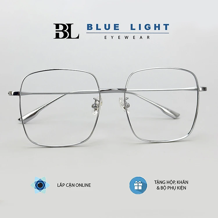 Gọng Kính Cận, Kính Giả Cận Nam Nữ TITANIUM - BLUE LIGHT Cao Cấp Siêu Nhẹ, Vuông To, Full Đen, Bạc
