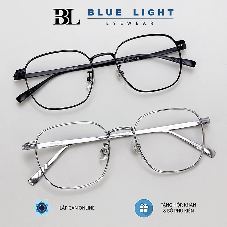 Gọng Kính Cận, Kính Giả Cận Nam Nữ TITANIUM Cao Cấp Siêu Nhẹ, Mắt Vuông To Dày Bản, Full Đen Bạc - BLUE LIGHT