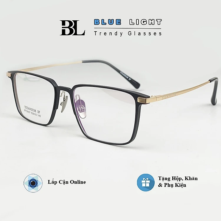 Gọng Kính Cận, Kính Giả Cận TITANIUM Cao Cấp Nam Nữ, Mắt Vuông Nhỏ, Lịch Sự, Sang Trọng, Gọng Đen Bạc, Đen Vàng, Full Đen - BLUE LIGHT